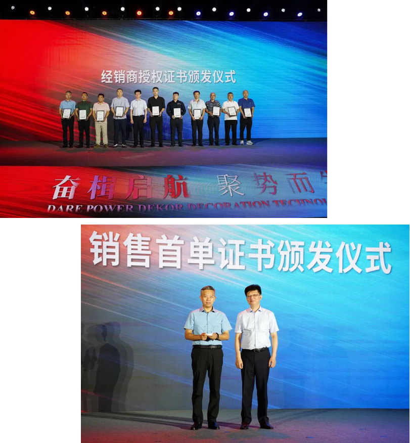 在经销商签约仪式环节,大亚集团副总裁、大亚人造板集团董事长眭敏向各区经销商代表颁发授权证书,为山东山谷林泉木业有限公司王雷王总颁发大亚圣象饰面板销售首单证书。大亚圣象的蓝图将与合作伙伴共同绘就,携手同行再造新辉煌!
